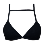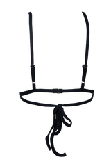 Triangle bralette with a decorative front strap along the neck line. Adjustable thin shoulder straps, back fastening with long straps to tie around. Customise the way you'd like to tie around the body. Wear the bralette underneath shirts or a cardigan. This style works best for A-B cup. Available with Black & White.