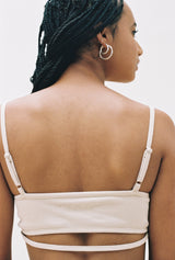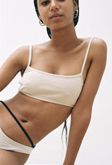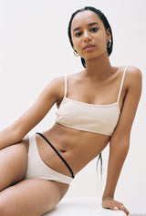 Frankie wears size Small, paired with Bamboo Brief in Toasted Almond.