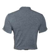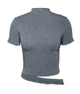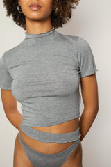 High neck cropped t-shirt with ruffle strap waistband. Form fitting, with an extra elasticated waistband as decoration. Pair with Flow Brief. Available in Mint, White & Grey Melange.