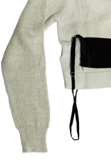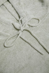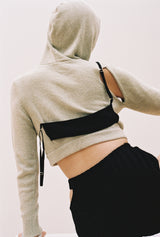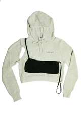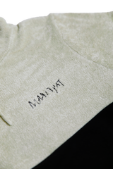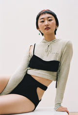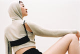 Mo Top is a knitted Hoodie with an overlay bra top detail and a shoulder slit on one side in Jade, with a black MARIEYAT writing embroidered on the left. Knitted from an Italian yarn that gives a soft and fluffy texture. Are you cosy ?