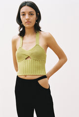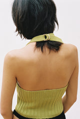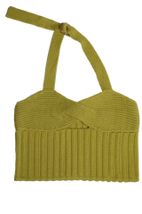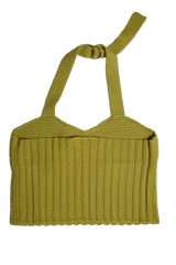 A halter neck knitwear top that features an intertwined bra top detail and a cut out in the middle, with an O ring to adjust at the back. You can wear Suna Top on its own or over a t-shirt or a long sleeve top.