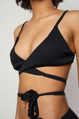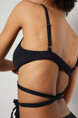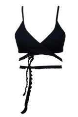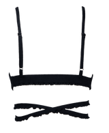 Wrap around bralette with lettuce edge straps. Customise the way you'd like to wear it with multiple ways of tying around the body. Pair with Angel brief to complete the look. Available in Black & Mint