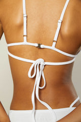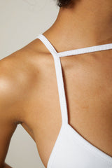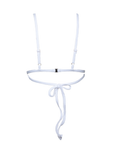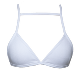 Triangle bralette with a decorative front strap along the neck line. Adjustable thin shoulder straps, back fastening with long straps to tie around. Customise the way you'd like to tie around the body. Wear the bralette underneath shirts or a cardigan. This style works best for A-B cup. Available with White & Black