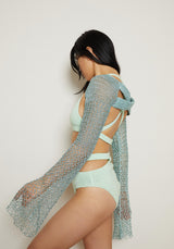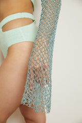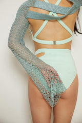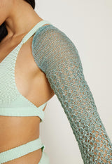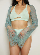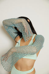The mermaid sleeves - hand crocheted in a Metallic Turquoise Japanese yarn, the sleeves are perfect to be thrown on top of your bikini, or your dance wear. Flair cuffs, with intricate hand knitting, elastic cross band at the back.