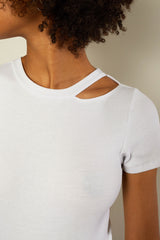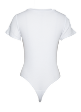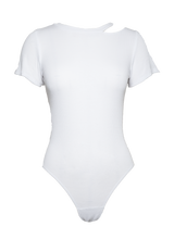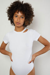 Short sleeve T-shirt thong bodysuit, with an asymmetrical cut out detail on the neckline. Thong style snap button fastening. Feeling embraced by the seamless cotton rib bodysuit. Available in White & Black.