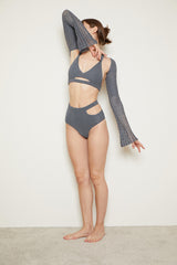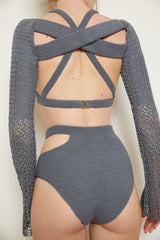The mermaid sleeves - hand crocheted in a Charcoal cotton yarn, the sleeves are perfect to be thrown on top of your bikini, or your dance wear. Flair cuffs, with intricate hand knitting, elastic cross band at the back.