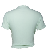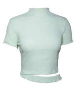 High neck cropped t-shirt with ruffle strap waistband. Form fitting, with an extra elasticated waistband as decoration. Pair with Flow Brief. Available in Mint, White & Grey Melange.