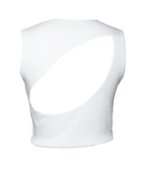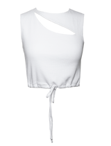 Vest cropped top with graphic cut out detail at the front, asymmetrical opening at the back, drawstring hem. Pair with Hunt Shorts in White.